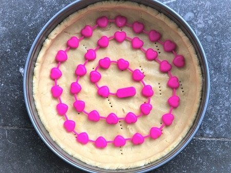 Bak eerst de bodem: Verwarm de oven voor op 170 graden (hete lucht oven). Bekleed met het deeg de binnenkant van de springvorm en maak met het deeg een klein opstaand randje van ongeveer 2,5 cm. Prik gaatjes in de bodem met een vork. Je moet nu eerst de bodem bakken. Om te voorkomen dat de bodem omhoog komt kan je de bodem vullen met bakbonen of bijvoorbeeld een bakkralen ketting, dit heet 'blind' bakken. Bak de bodem in de oven in ca. 25 minuten tot hij licht verkleurd maar nog niet goudgeel is. Laat de bodem afkoelen op een taartrooster en verwijder voorzichtig de ring van de springvorm. Verhoog de oventemperatuur tot 220 °C.