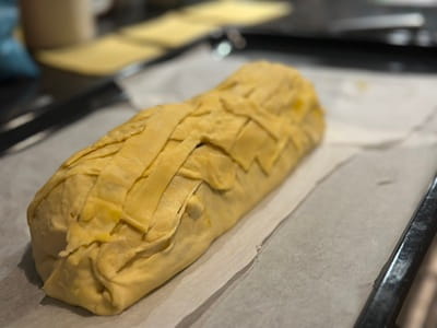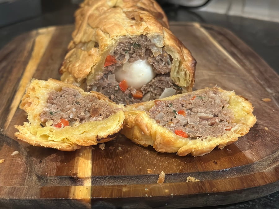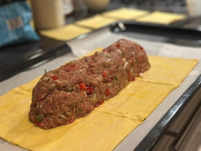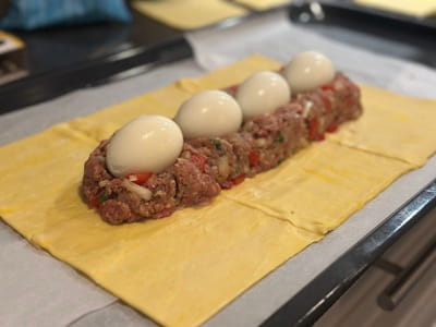 - Maak het brood: leg 6 plakken bladerdeeg op een bakplaat zodat ze samen een rechthoek vormen (zie foto). Leg in het midden van de 6 plakken in een broodvorm de helft van het gehakt (zie foto's). Leg hierop de 4 hardgekookte eieren en bedek ze met de rest van het gehaktmengsel. Vouw het bladerdeeg vanaf de onderkant omhoog rond het brood en gebruik het overige plakje bladerdeeg om de bovenkant af te dekken met reepjes bladerdeeg in de vorm die je wilt. Bestrijk het bladerdeeg met een losgeklopt eitje voor een mooie glans.