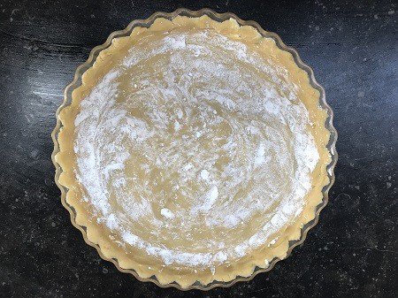 Maak eerst het deeg: meng de bloem met 100 gr. suiker, de boter, het ei en het zout tot een mooi soepel deeg. Maak er een bal van en leg deze in vershoudfolie in de koelkast. Vet ondertussen de vlaaivorm in met boter. Omdat de vulling zacht wordt en pruttelt kan je het beste een ruime vlaaivorm nemen van 24 - 28 cm (taart op foto is vorm van 28 cm).