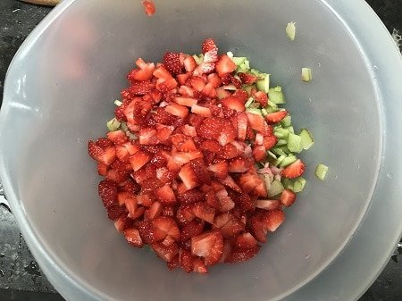 Maak nu de vulling: was de aardbeien en haal de kroontjes eruit. Was de rabarber en snijd de lelijke puntjes van beide uiteinden. Snijd de rabarber en de aardbeien in kleine stukjes en doe ze samen met 3 eetlepels maizena en de rest van de suiker in een kom. Roer het even door elkaar. Voeg nog een halve eetlepel maizena toe en roer totdat deze ook goed is opgenomen door het vocht.
